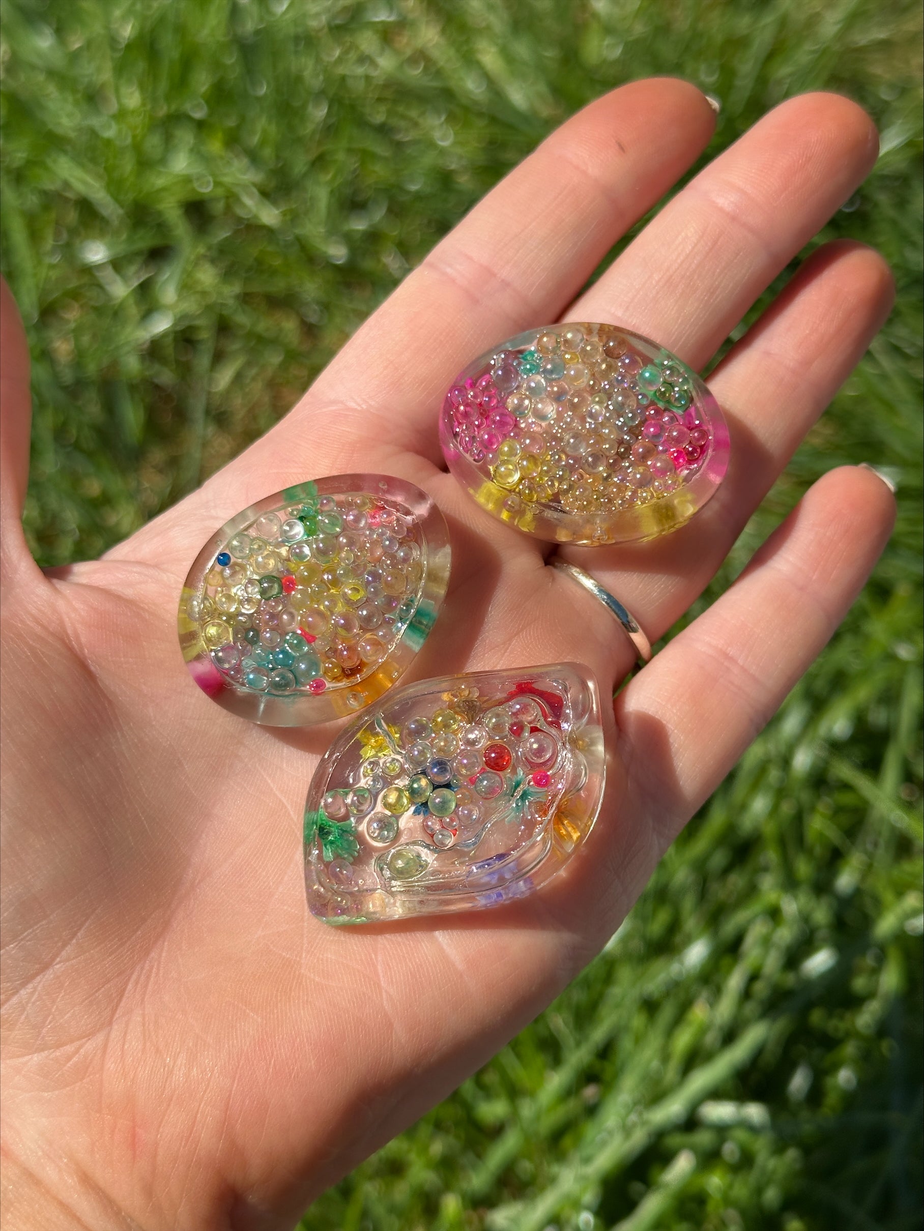 This beautiful worry stone is smooth on the thumb side and textured with beads on the back, providing a unique tactile experience. Encased in clear resin, dried colourful flowers add a touch of nature's elegance inside the worry stone. Available in multiple shapes, you can easily choose your favourite from the drop-down menu. Embrace calmness and style with this delightful, functional piece today!